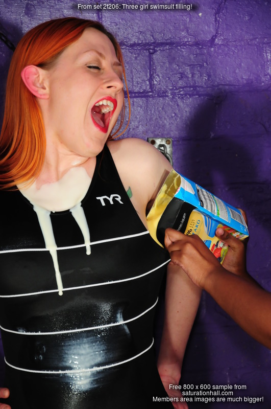 And let the swimsuit filling begin! All three girls get their water-wear comprhensively filled with cream and custard, and then totally covered on the outside too, along with the rest of their bodies, their faces, and their hair - very thorough messing with not a spot left uncovered. Swimsuits are of course meant to get wet, but how will they handle being totally messy inside and out too? Watch this scene to find out!