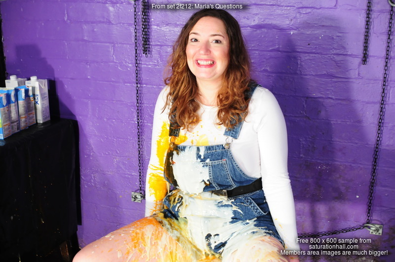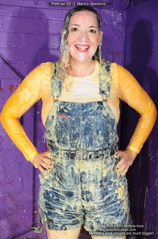 Maria, wearing short denim dungaree, or as they are known in the US, shortalls, with a thin long-sleeved white jumper, takes the Saturation Hall quizz. And gets pelted with mess every time she gets a question wrong, and sometimes even if she gets them right!