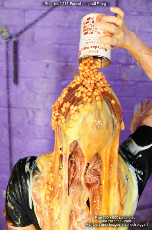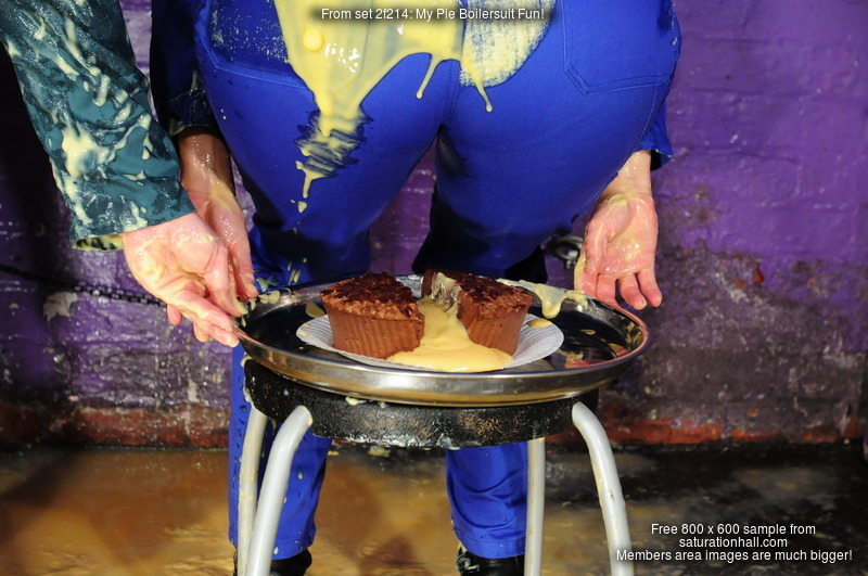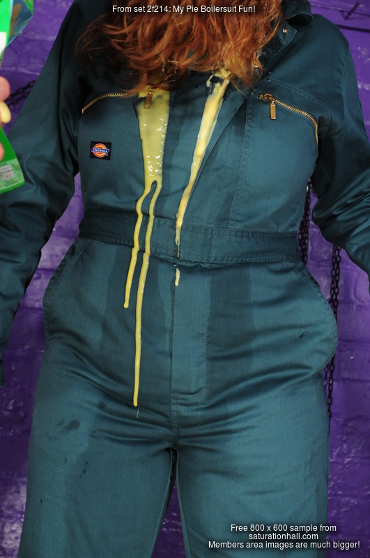 As the host, Rosemary graciously submits herself to be gunged first, and Maria gleefully sets about filling her nice blue jumpsuit with custard, both runny value custard in tins, to flow down and thoroughly wet the inside her Rosemary's outfit, and the thicker cartons of custard, to really fill the suit and sqush and squelch against her skin and the swimsuit she's wearing as underwear.