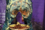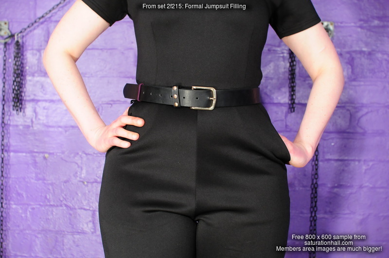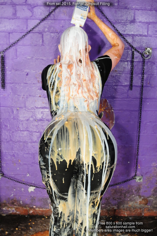 As with all Saturation Hall scenes, this one is filmed so we can see all of the action - the video avoids zooming in so as to allow you to watch as the gloop slips down inside Friday's suit and starts to seep and leak out at her trunk and legs, while the still photos give you clear and high-resolution views in both full-height and close-up as the mess flows and gathers inside Friday's Speedo suit.