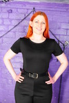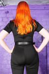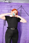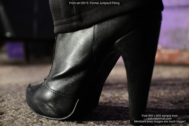 Dressed in a very smart black formal jumpsuit, with a black leather belt and black leather high heels, and with her vibrant red hair, Rosemary is about to treat herself to a serious mixed-mess messover in the dungeon.