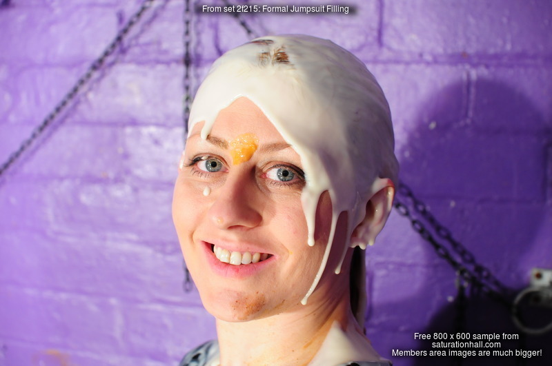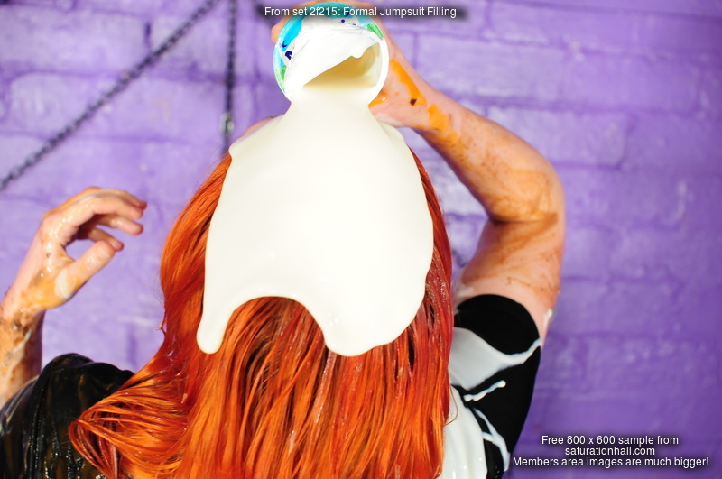 Once Rosemary is nicely messy and with obvious dampness soaking through the front of her suit from inside, it's Maria's turn to cease to be clean, and her green suit begins to suffer too as Rosemary sets about merrily pouing custard into it, while Maria accepts her wet slippery fate, unresisting as the mess is poured in.
