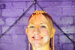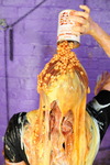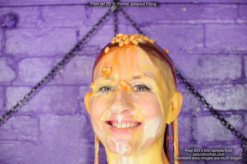 Eventually the questions end and Maria just grabs all the remaining mess and pours and smears it all over herself, covering her hair and face as well as completely coating her outfit and body in mixed mess.