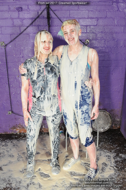 To start with, Lily stays all nice and clean and dry, while she gradually wrecks Felicity's outfit with ever more creamy goodness. Felicity's running pants suffer first, being well filled front and back, and she does various exercises to really make the creamy filling show through from inside. Her top soon succumbs too, being filled front and back, and then Lily just pours more creamy dream all over the outside of Felicity's clothes. Felicity's basketball boots get well filled too, while still on her feet.