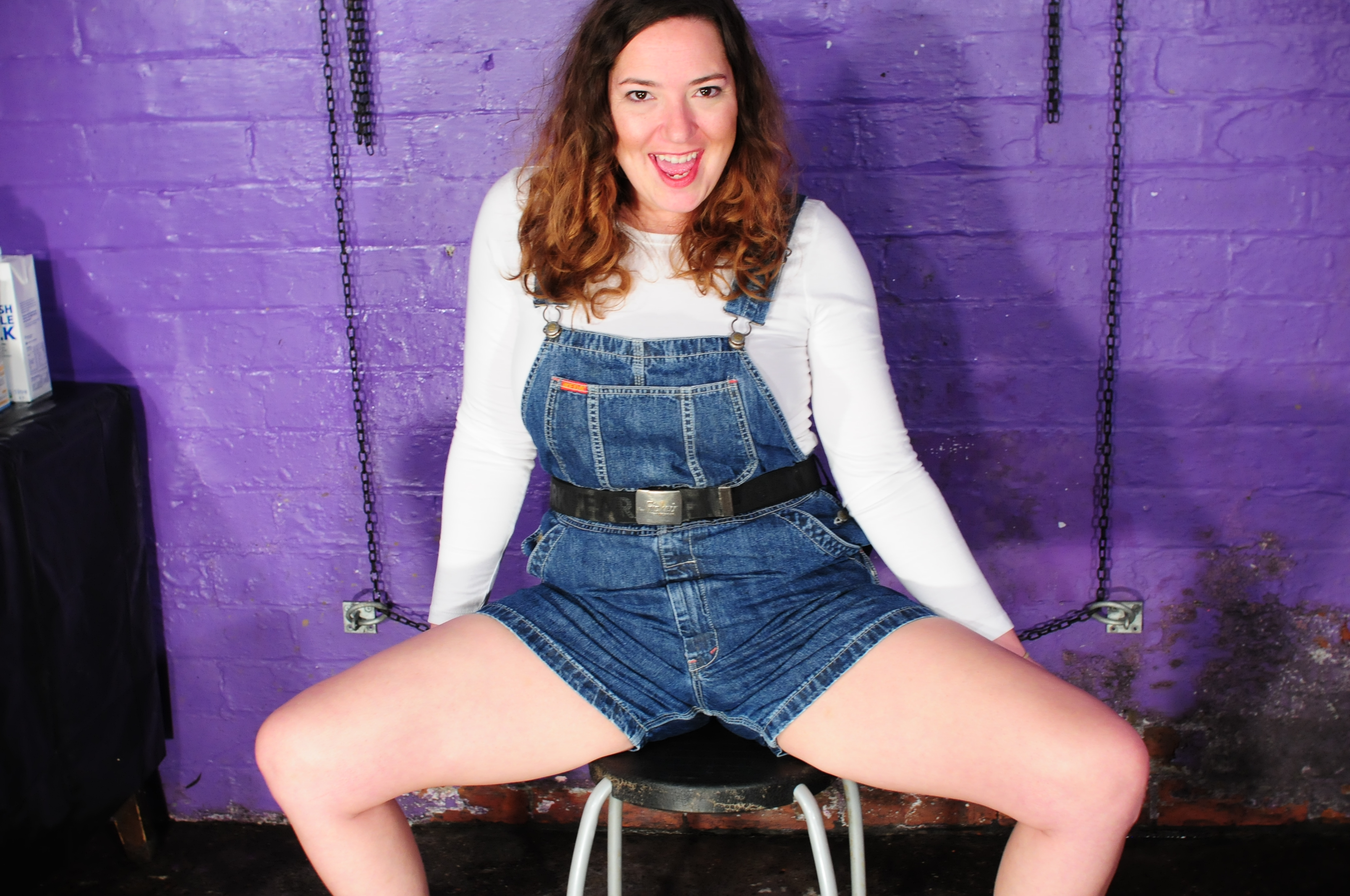 Having shown off her outfit she takes a seat and "assumes the position", legs wide akimbo to provide optimum target area, and starts to answer the questions. We thought we'd start off with a nice simple one that anyone visiting these hallowed halls would be expected to know, who is the current British head of state, the answer of course being HM the Queen. Unfortunately for Maria she got mixed up between head of state and prime minister, and so the messy demolition of her outfit begins with the entire contents of a can of custard thrown straight into her dungaree-clad crotch. Oops!