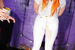 First she fills the front of her suit with cream, which initially doesn't show, and then starts to seep through the fabric at about waist height. She follows the cream with a can of tomato soup poured inside, and that causes the cream to flood through the crotch of the suit while the soup itself flows into her legs and gets trapped by the legsuit's rubberised leg hems, designed to prevent it sliding up when swimming.