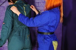 Rosemary wears a smart royal blue boilersuit with a black belt to pull it in at the waist, Rosemary wears a beautifully fitting green suit, both are by Dickies workwear. Rosemary teams hers with 3" heeled New Rock boots, while Maria wears transparent ankle boots and rolls her suit's trouser-legs up a little.