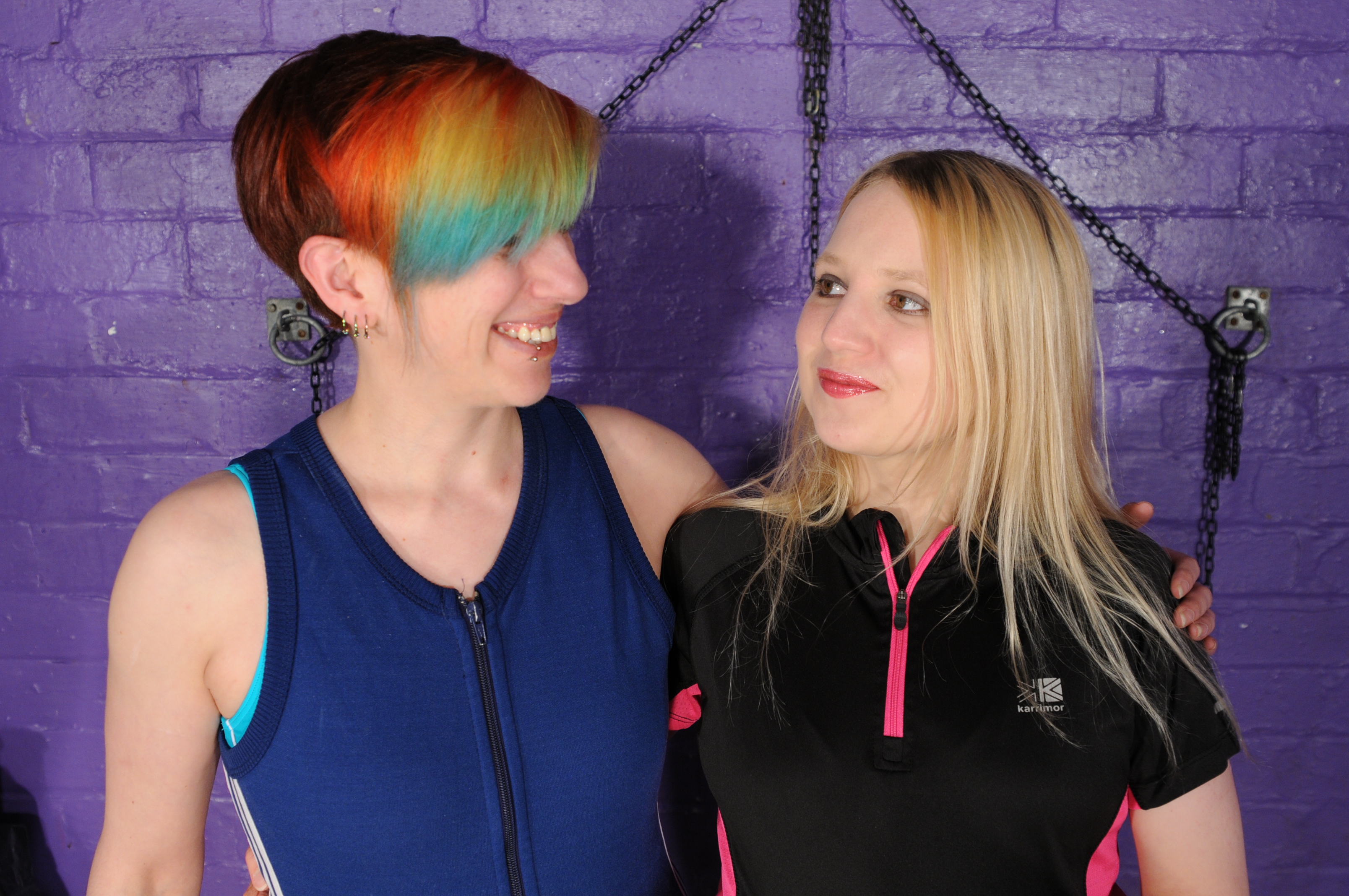 Felicity and Lily are dressed for the gym. The very messy, creamy gym. Lily is actin as the therapy lead, with Felicity as her patient. Felicity wears black Karimor running trousers and a black and pink short sleeve zip top, over a black swimsuit, with black basketball boots. Lily wears a unique blue Adidas three-stripe capri-length sleeveless unitard, over a turquoise swimsuit, with blue and white deck shoes. Both girls are sockless, barefoot in their shoes.