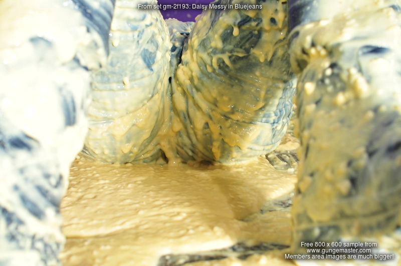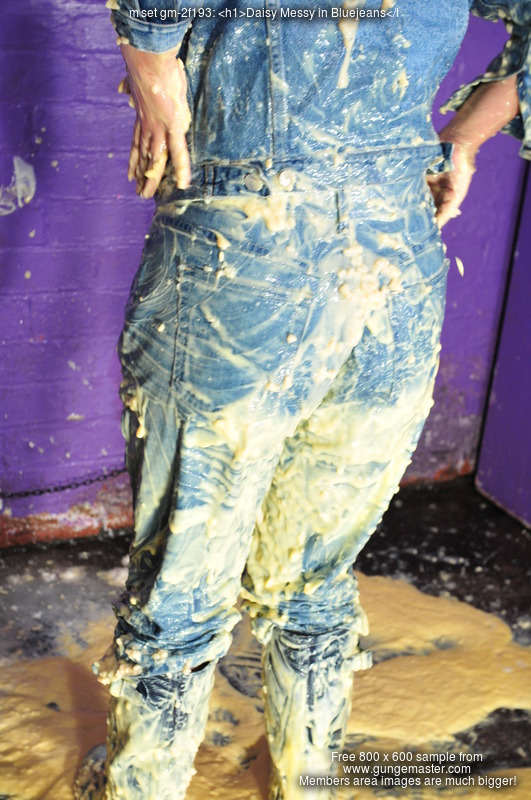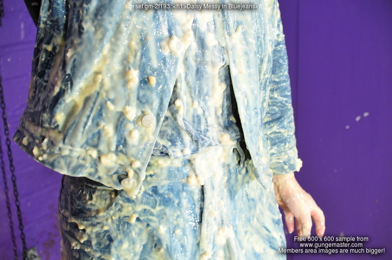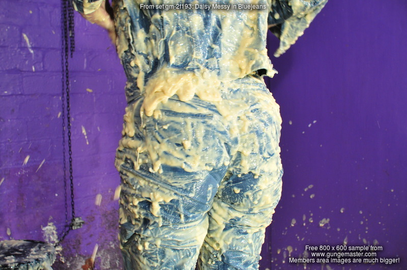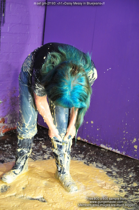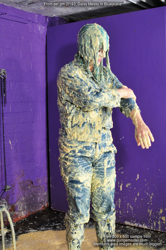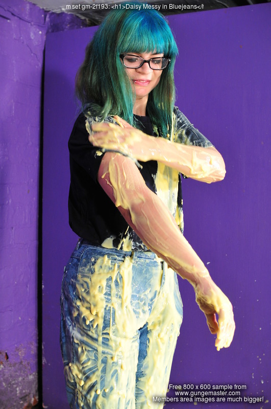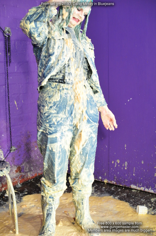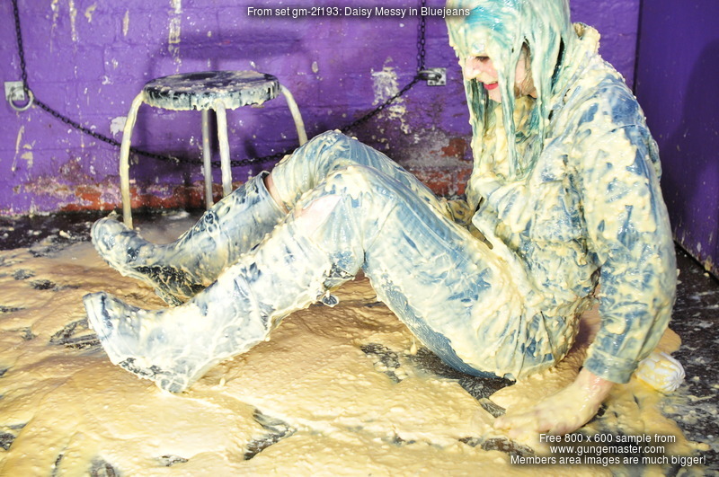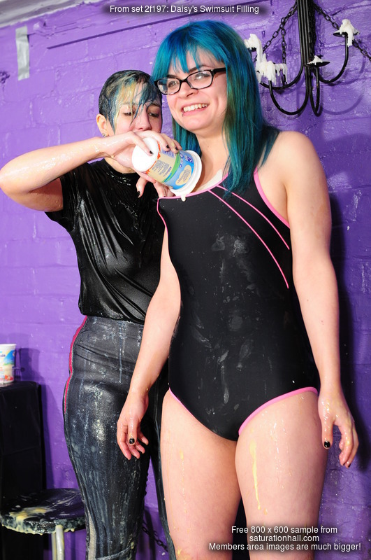Note that Daisy stays completely clean and dry bar a few small splashes and smears on her swimsuit. Have no fear though, Daisy's swimsuit is of course in line for a thorough filling in the future. Saturation Hall - where no clean lady goes ungunged for long.