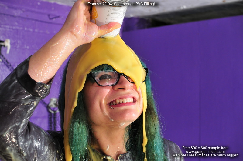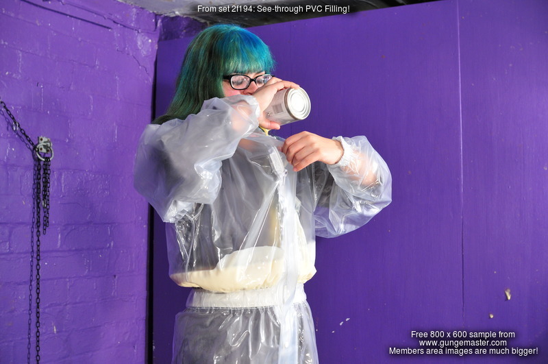 Eventually she pulls out the front of her see-through PVC suit and all the trapped gunge floods down over her trunk and legs in a massive flow, to end up trapped in her lower legs.