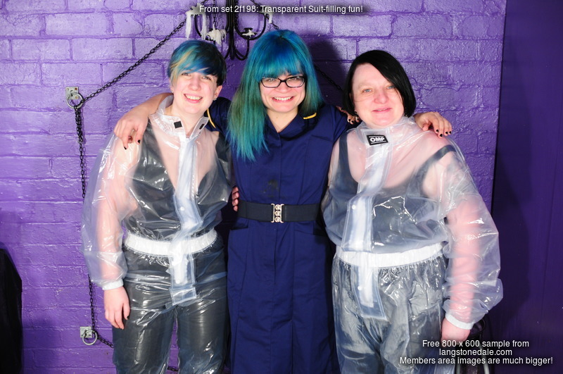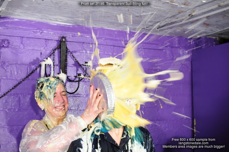 Something a little bit different: Evelyne the Cook, and Virginia, are both dressed in see-through OMP plastic jumpsuits, worn over simple black trousers and tops, and with wellies on their feet, while Daisy is in a dark blue nurses uniform dress, with matching dark blue wellies. Daisy is going to fill the other two's suits with mixed sweet mess - syrup, custard, and Devon Dream - and we'll get to watch the gloop flowing down inside the see-through suits while enjoying the gasps and reactions as the cold gloop slithers down.