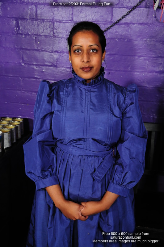 Teena gets the treatment first, gently at first with Friday just tipping a little Devon Dream down inside the high collar of her almost Victorian gown. But the dress material wets through almost immediately and from then on it's steadily reduced to ruin, Teena meekly accepting everything Friday does to her.