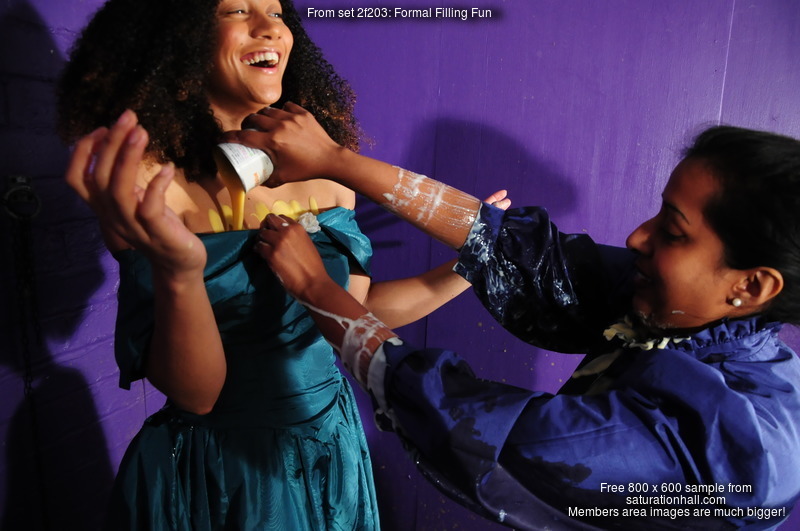 Of course eventually the tables turn, and now it's Friday's turn for the treatmemnt, and her beautiful turquoise gown soon begins to suffer too as the cream and custard is poured in.