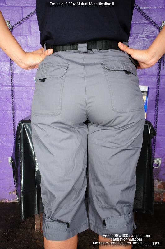 Next comes custard and cream poured into Virginia's trousers, she holds them out herself while Daisy pours the mess in down the front, and in the photos you can clearly see Virginia reacting as the cold wetness slides down inside and flows down her legs, while the video has a close-up of her trunk and legs and you can clearly see the material bending and moving as the custard pours in and flows down inside. Once plenty has been poured in the front, Virginia turns round and has more poured in the back. Somewhat to everyone's surprise, none of the gunge seeps through, although we can clearly see the fabric moving as the mess flows down inside, they do a remarkably good job of keeping it all inside. Clearly that will never do so next Daisy prepares a tray of custard and syrup, and then has Virginia sit in it. That's better, now she's becoming a proper mess!