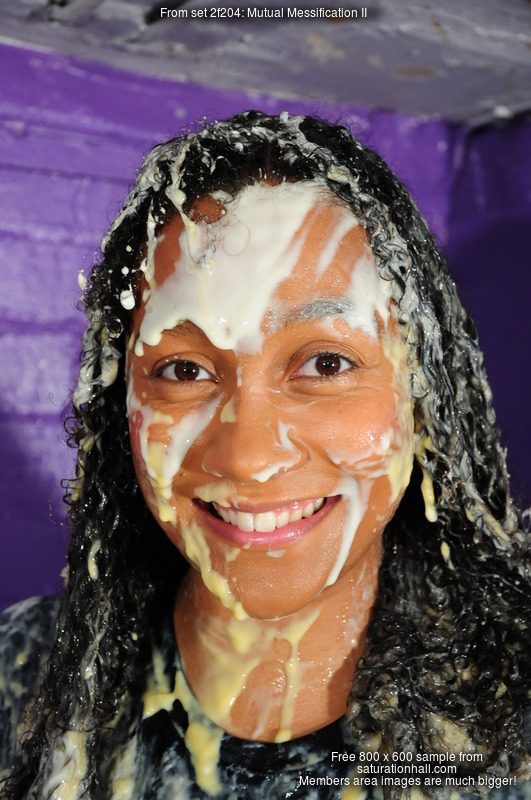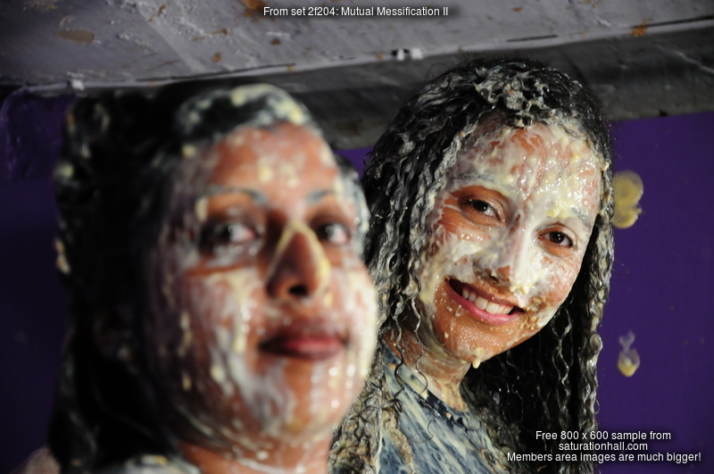 Usually, when we have two or more girls messing each other up, they'll take turn and turn about, the recipient passively accepting her messing, until the turns change, and she gets to get her own back, the other girl now passively accepting the next bit of her own messy fate. However, in a mutual messification session, things operate a little differently, and the two girls mess each other up at the same time, each ignoring what's being done to herself while she concentrates on what she is doing to her opponent.