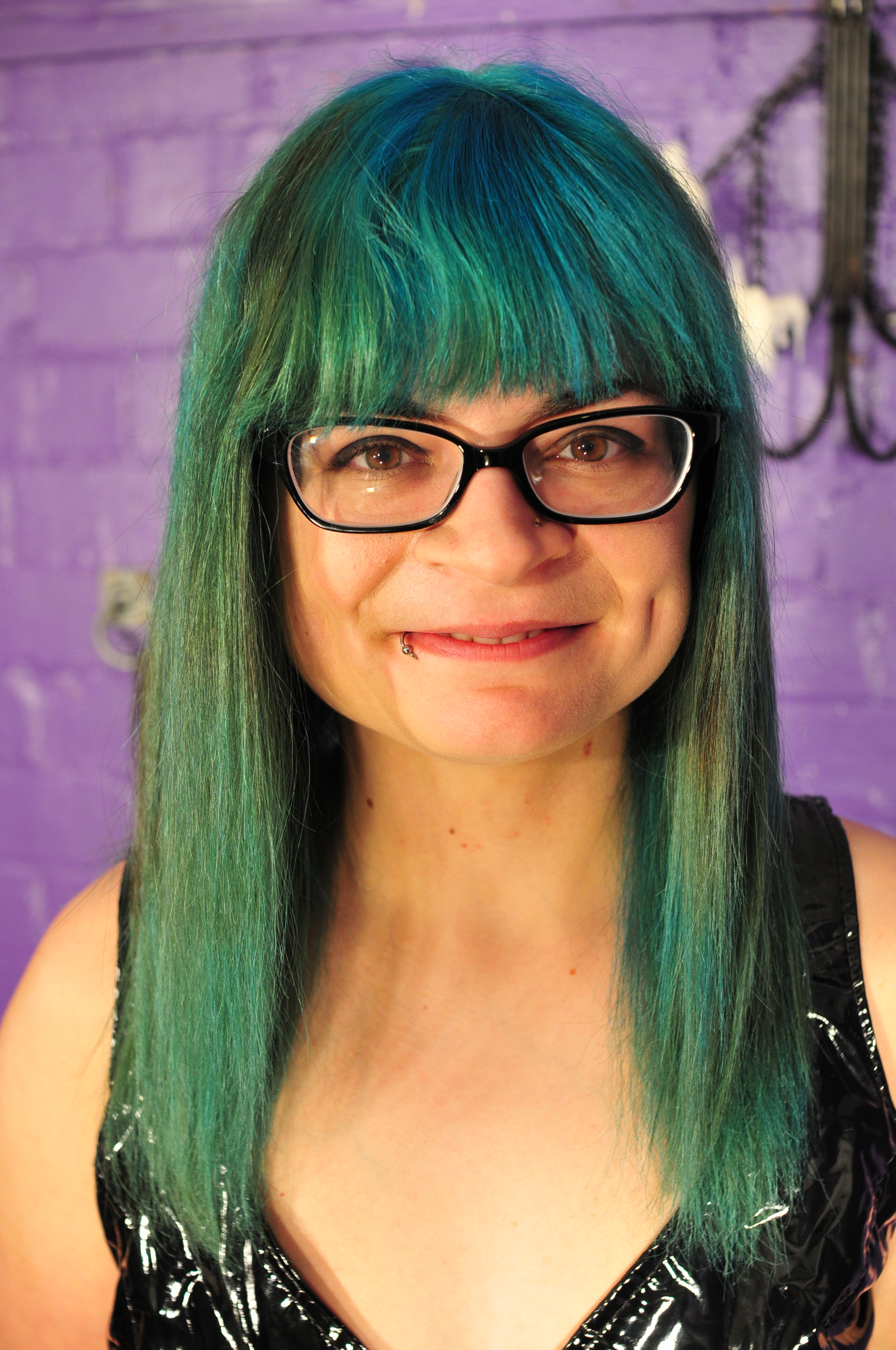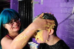 Turquoise-haired Daisy covers her denim outfit with custard and cream