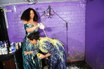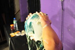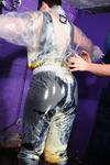 Eventually, she takes the by now very messy clear PVC suit off, and finishes off her silky silver jumpsuit before giving her bright green hair a very thorough honey and custard shampoo, including pouring custard and honey down her face and through her glasses.
