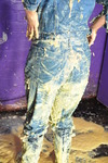 The suits have quite tight elasticated waistbands, so initially the mess gathers at the two willing victims' waists - but then the waistbands are pulled out, and down it all floods!