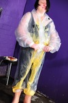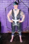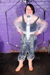 As she pours the gunge in we get to watch through the crystal clear plastic as it pools and collects at the tight waistband, slowly spreading out round her waist till it flows all the way round her back, but the tight elastication of the waterproof suit stops any leaking down to her legs. She sits down and pours more gunge in down the back of her neck, now some does leak down at her bottom and starts to flow down the backs of her legs, but the front still holds firm even as she pours even more goo in.