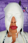 She begins by filling her shorts with Devon Dream, then completely coats her beautiful boots, drenches and fills her top and breasts, gives her beautiful jet black hair a very creamy shampoo, and finishes off with a full cream facial.