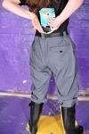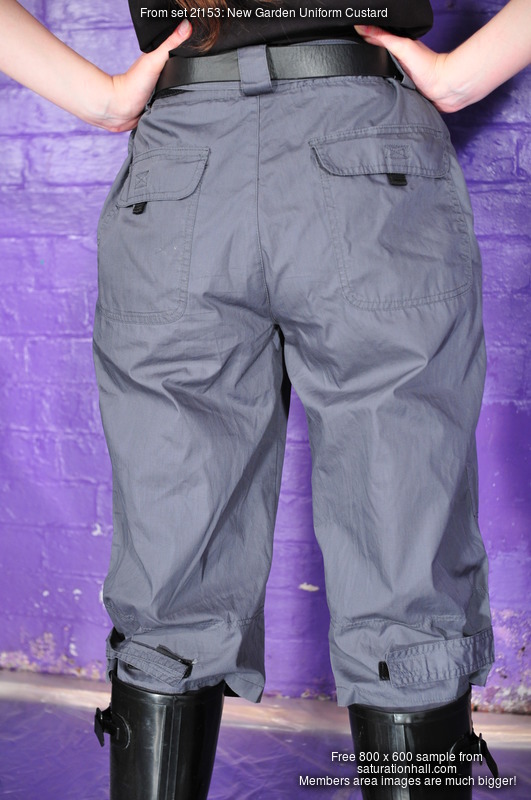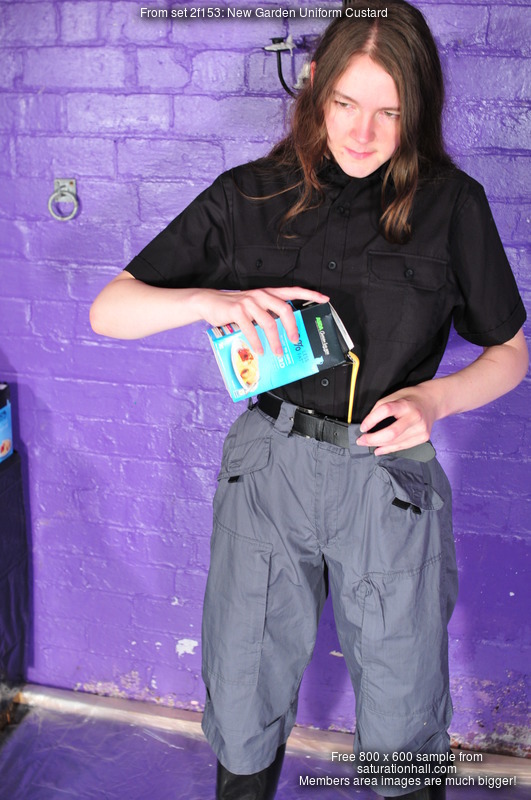 She starts the tests promptly, pouring entire cartons of custard into the front of her long shorts, nothing comes through but you can see the material twitching as the custard flows down inside each leg, and then it drops out at the knees and goes all over her boots. She turns round and pumps more custard in the back, again we can clearly see the material of her shorts moving and responding as the large dollops of custard flood down inside, and you can imageine how it feels as it flows over and around her bottom and down her legs, inside the shorts.