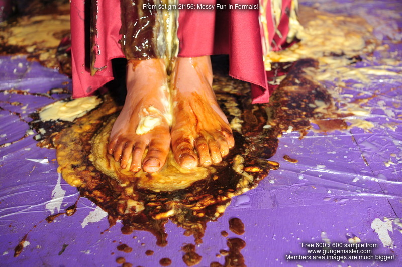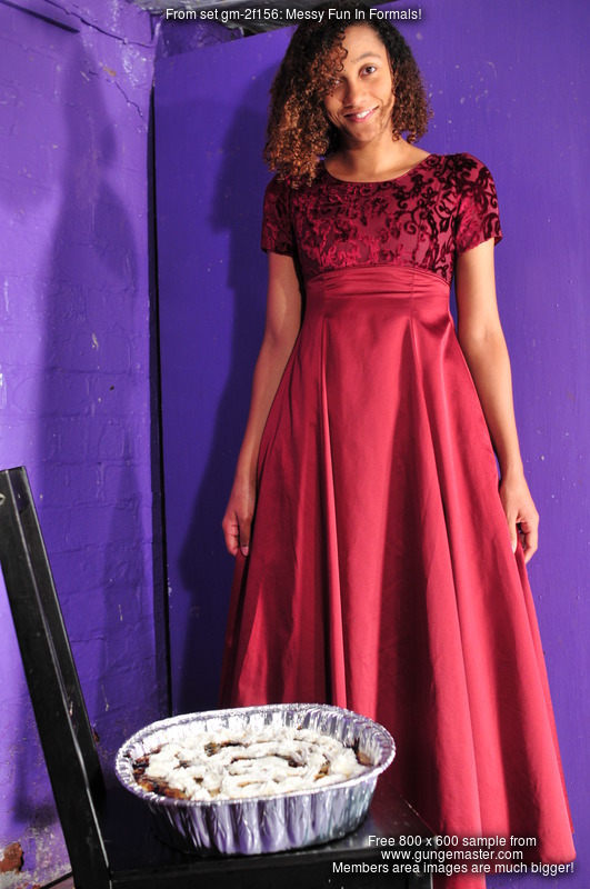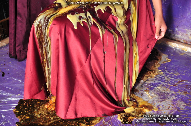 Chastity and Friday each wear a lovely formal dress, Friday's deep burgundy, Chastity's a beautiful purple. Friday is the first to start giving her dress the treatment, she watches with interest as Chastity fills a deep silver tray with mixed custard, syrup and black treacle, topping the mix off with squirty cream, and then, completely unresisting, Friday carefully lowers her shapely bottom into it, utterly drenching the seat of her lovely gowwn and wiggling herself down into the mess for maximum coverage. Friday stands up again to show off the damage on the back of her dress, before sitting again and allowing the still completely clean Chastity to pour more and more mess into and down the front of her dress until it's been entirely drenched in mixed mess.