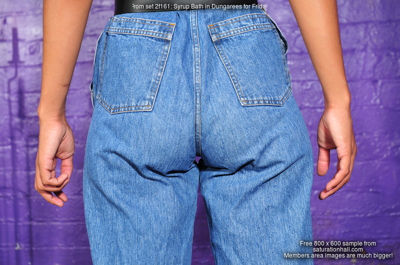Next, she walks over to the bath, and lowers herself in, bottom first, the lovely clean soft denum of her overalls squishing and sinking into the oozing sugary gloop as it slowly engulfs her. Evelyne is on hand with a large gallon container of more syrup, which she starts pouring all over Friday's front even as she's playing wity the pool of syryp she's sitting in. Some of the pouring goes down inside the bib of the overalls, to ensure Friday's swumsuit gets a proper coating too.