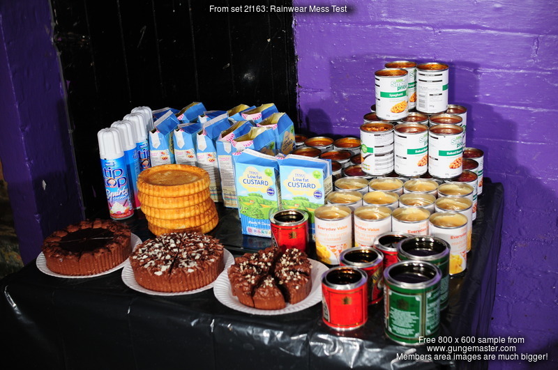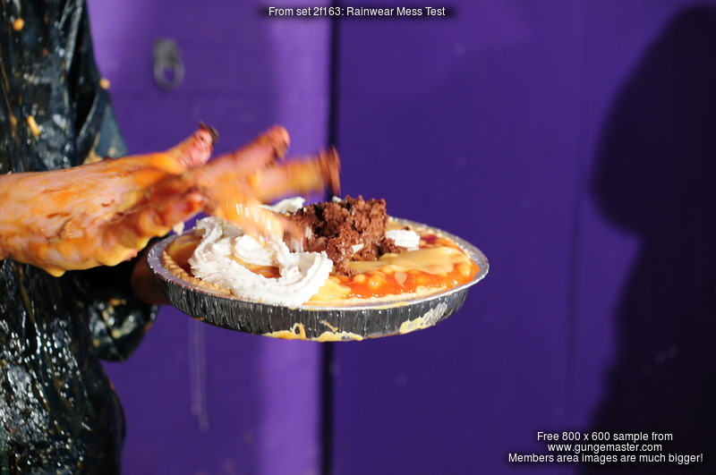 And then the messing begins! Veronica takes a pie to the face to start, the a pie sandwitch, and then lots of custard poured all over her clothes. Meanwhile Eliza, who is initially testing the effects of gunge poured inside her waterproofs, is treated to a very thorough clothes filling, down the front of her trousers, down the back, her hood filled and then raised and splashed onto her head, and her jacket, done up again after being opened for the trouser fillings, filled too.