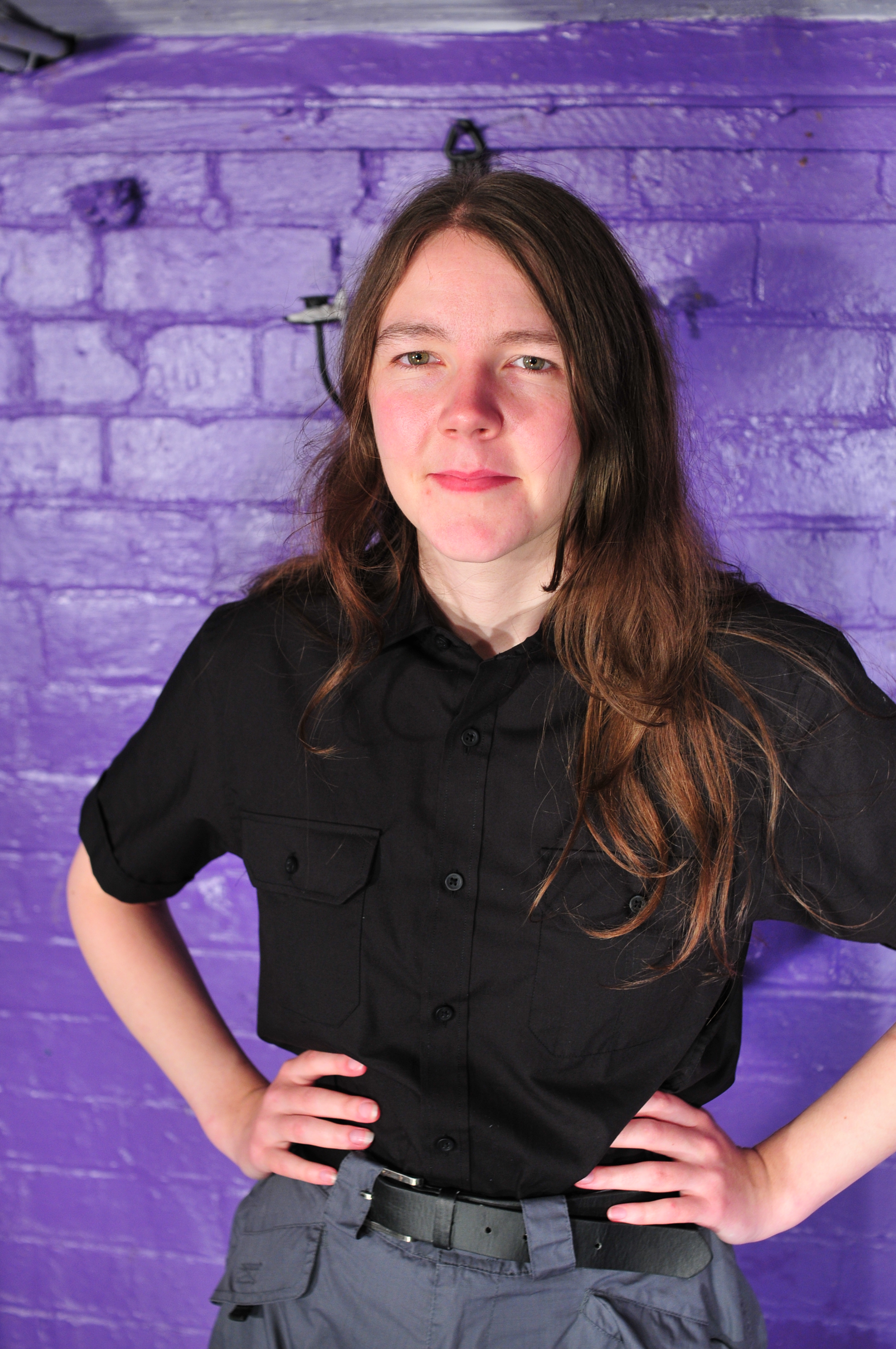 Chastity has an all-new workwear ensemble for working in the gardens, so of course it must be put to the messy test. Her outfit comprises a pair of long, quite baggy grey shorts, which come down to her knees, black wellies, and a black short-sleeve oversize shirt, tucked into the shorts.