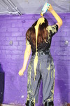 Having done her front she turns and does her back, pouring lots of custard down over her long hair, covering it as well as her shirt and trousers. Milk is added to custard, lots of cartons, and it floods over her face as well as her shirt and trousers.