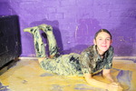 Friday is now completely drenched in custard, her top, trousers, and shoes are filled, her entire boady is coated, and her hair completely soaked in it. So she carries on with the workout, bending, stretching, posing, reaching, really showing off how totally messed up she is, from head to toe.