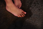 Friday, barefoot and simply dressed in denim dungarees over a black swimsuit, is about to get very, very, sticky. In the dungeon is a bath of golden syrup. There's also syrup on the floor, and she first plays in this with her bare feet, squishing her toes into it.