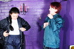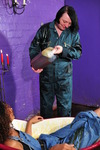 Needless to say, it's Chastity's turn next! Splat! Splat! Splat! go the flans, filled with custard and topped with squirty cream, one each to chest, trunk, and bum. Now it's Chastity's turn to have fresh milk poured into her bodysuit, some leaks through the through fishnet clad legs, to collect in her nice black wellies.