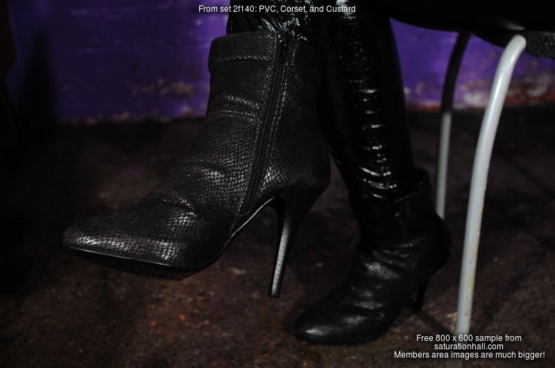 Lady Rose is dressed for pleasure, wearing a sleeveless PVC catsuit under a black satin corset, with high heeled ankle boots and long black opera gloves, and she's going to get very, very, messy.