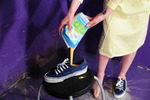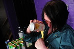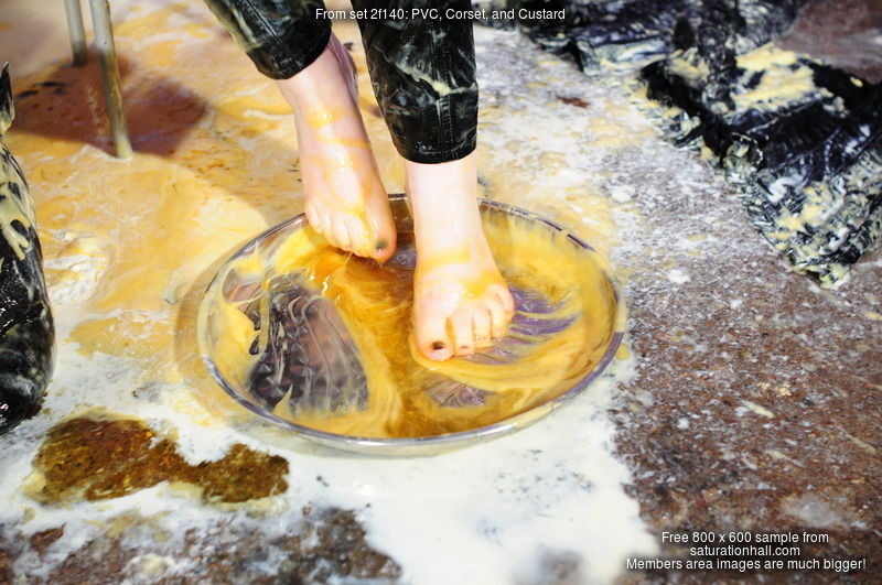 Custard down her corset come first, then more down the inside of her PVC suit. Her boots get carefull treatment to ensure they are drenched in gloop, and her hair gets a milk-and-golden-syrup shampoo.