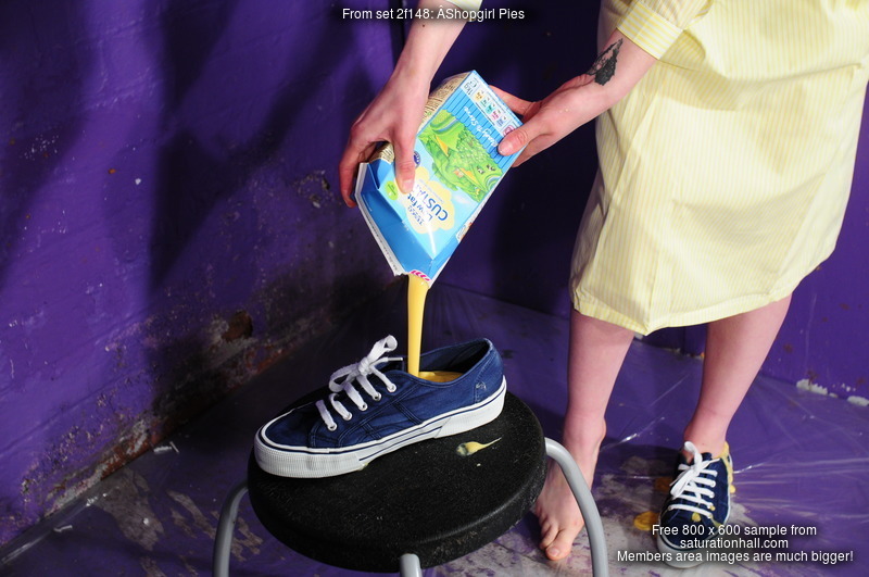 Chastity's knickers don't sag the way Kitty's did, but the custard soon starts to seep through the fabric and drip down Chastity's shapely legs. At which point Kitty decides it's shoe time, sits Chastity down on the already messy chair, unlaces Chastity's shoes, and fills them with custard, before putting them back on Chastity's feet and lacing them back up again. She also fills Chastity's bra top with custard, just to balance her already filled knickets.