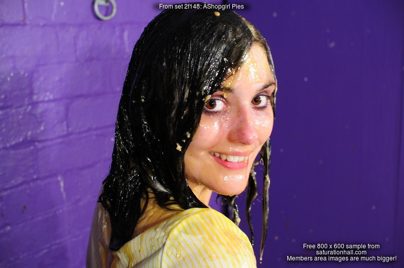 Kitty graciously volunteers to take the new round of punishment first, sits down, and calmly allows Chastity to thoroughly fill her polo shirt with custard, front and back. Once she's been thoroughly filled, her shirt is neatly buttoned up and her collar stood up, carefully gunged all round, and neatly put back down again. She stands, and Chastity finishes off all remaining clean parts of Kitty's skirt in a deluge of yellow.
