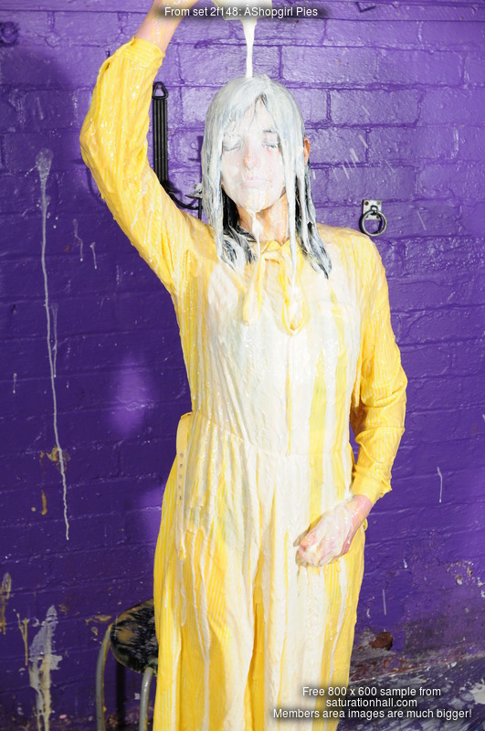 Very slowly, little by little, her ladyship gradually fills and covers every inch of her outfit and herself in thick yellow fluid. Pockets are filled, floor pools are sat in, full buckets of custard are played with and eventually poured over the costume, she even shampoos her hair in the bucket of custard.