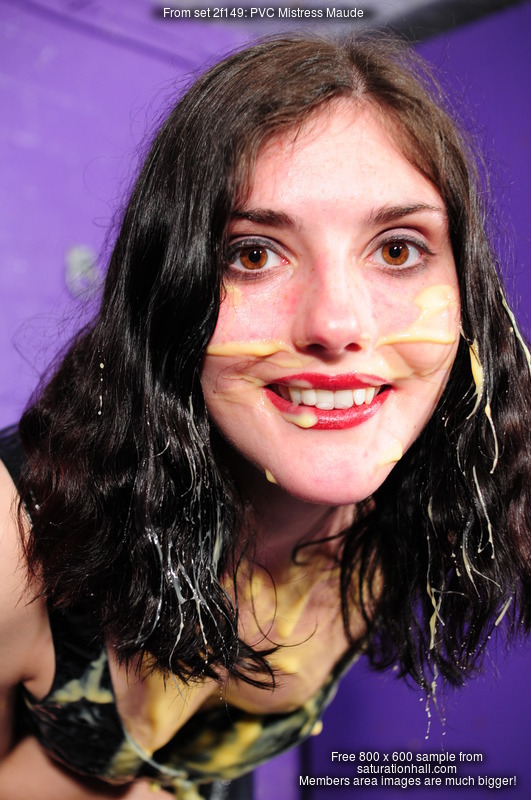 Maude the chamberwench as you've never seen her before, with jet black hair and dressed from head to foot in shiny black PVC! And not only does she look totally awesome in her glossy outfit, but she first fills, and then covers herself, in lashings of thick yellow custard!
