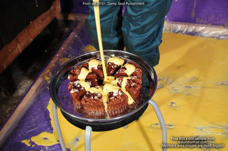 Kitty is then made to take her skirt off again, and has even more custard poured into her well-filled gym knickers, before being told to sit down, which releases a flood of custard from her knickers as they are pressed against the seat.