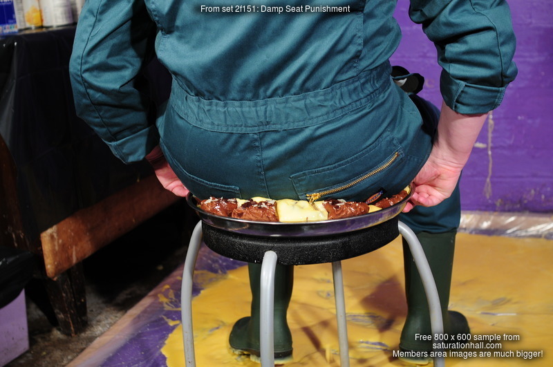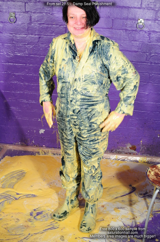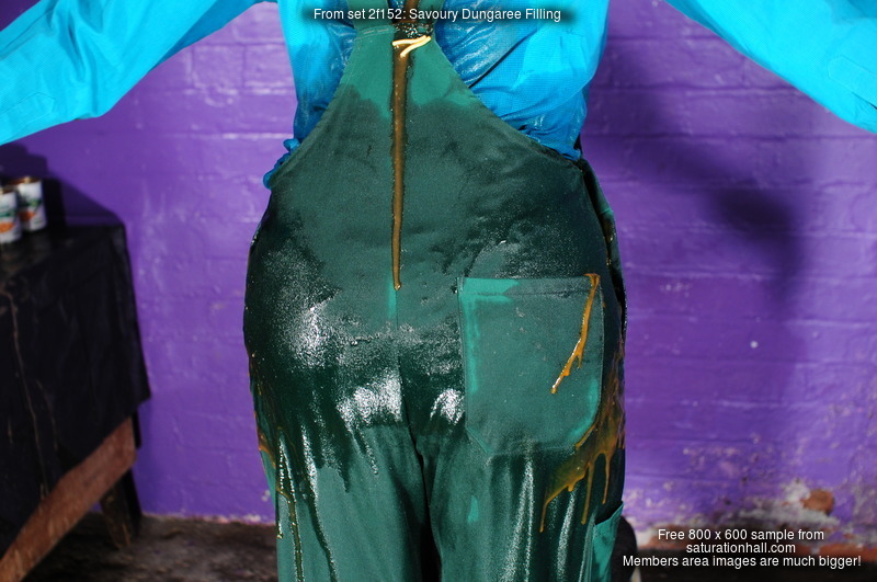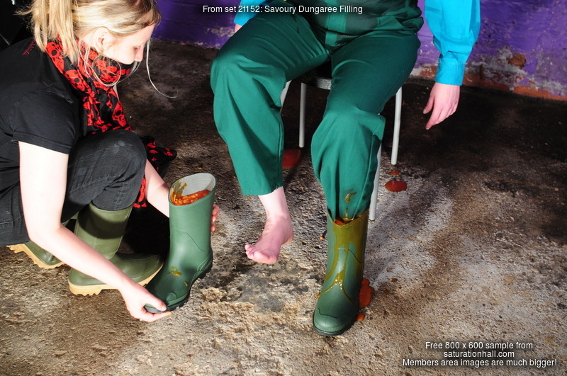 Without standing up she spins round on her seat and Felicity pours even more beans and soup down the back of Lady Amaranth's shirt, to collect in her dungarees and spread the sauce-mess even further. Eventually, with her overalls absolutely full of mess, her ladyship turns back to the front and then stands up, sending the vast pool of mess that's accumulated around her seat cascading down inside her trouserlegs to get trapped against her already filled wellies. She turnd round so we can see the terrible mess of her overalls, and steps out of her boots to allow the trapped mess in her legs to escape.