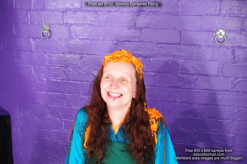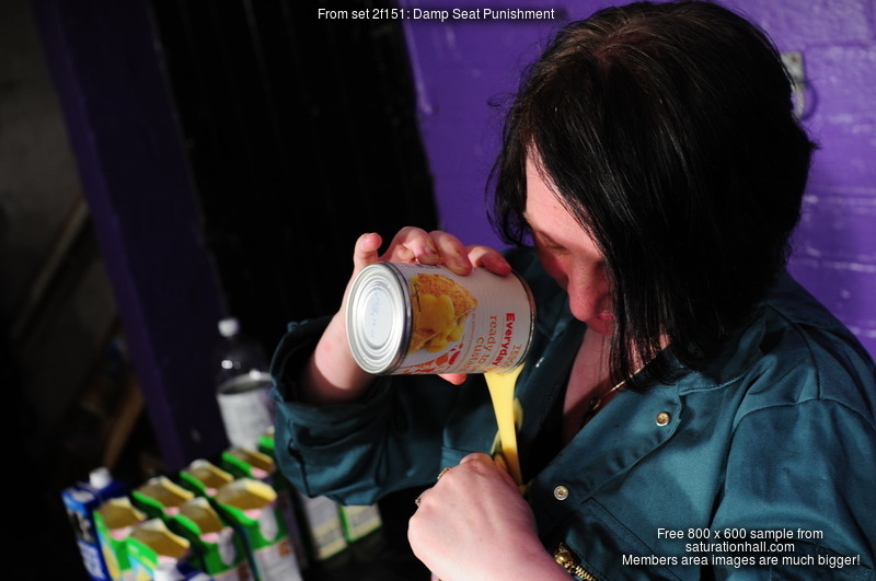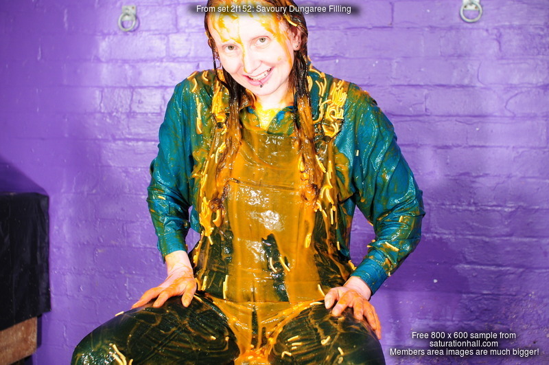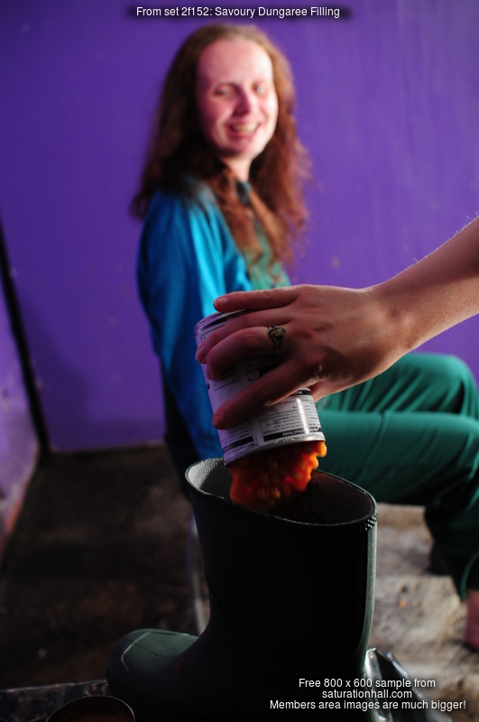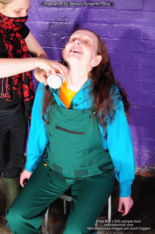 How much mess can we fit into Lady Amaranth's green dungarees and uniform shirt? This is the kind of question we like to answer here, and so Lady-A willingly volunteers for a spectacular savoury sliming, at Felicity's hands. She starts with beans. Lots and lots of beans, can after can tipped into the bib of her ladyship's green overalls. After a few pours, damp stains start to show between her legs as the bean sauce starts to soak through the fabric, but Felicity doesn't think it's really happening fast enough, so in go the cans of tomato soup to help spread the wetness!