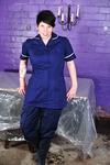 Chastity wears a dark blue nurses uniform dress, belt, and wellies. Kitty wears a dark blue nurses uniform tunic and matching trousers, and matching blue wellies.