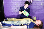 Two willing women in smart blue medical uniforms, and lots and lots of custard - the perfect prognosis for seriously messy treatment.