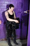 Chastity is dressed for clubbing, black PVC jeans, New Rock boots, and a little black PVC lace-up sleeveless top.