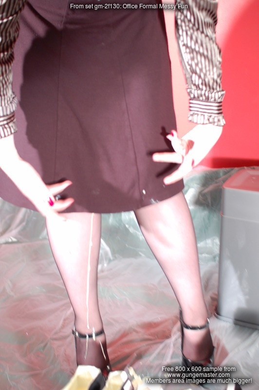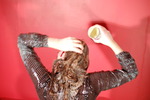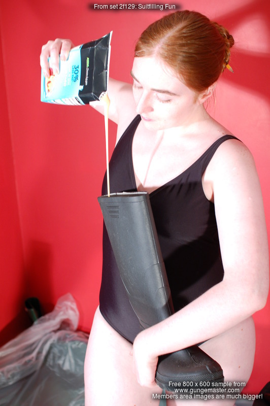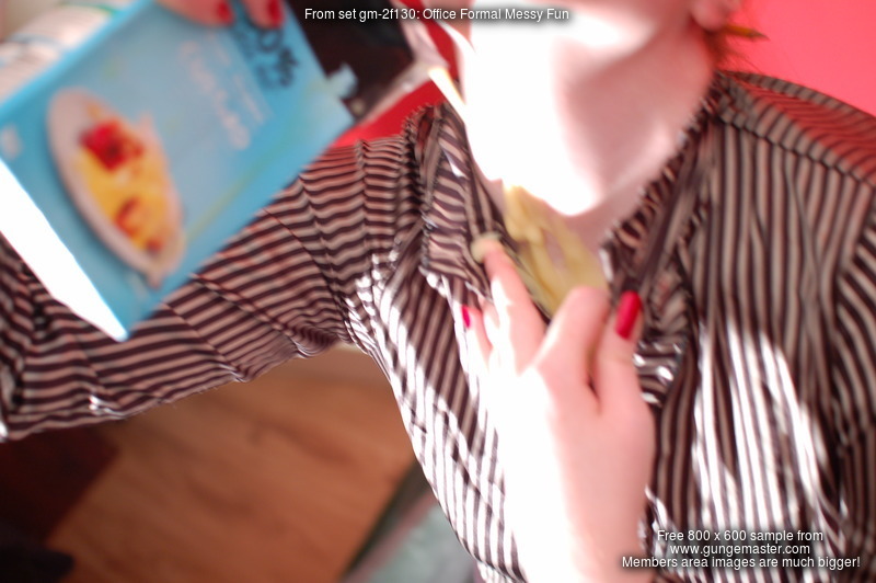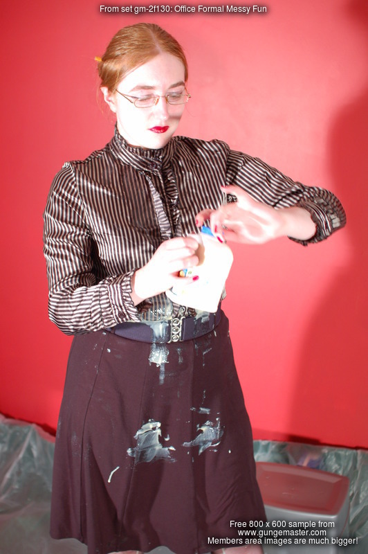 She pours custard, then milk, then syrup, into her skirt, inside her stockings, inside and over her blouse, all over her shoes, and by the end of her very careful, deliberate, and total gunging, she is completely saturated in mess from head to toe. Her beautiful long red hair does not escape the treatment either, and she finishes with a honey facial.