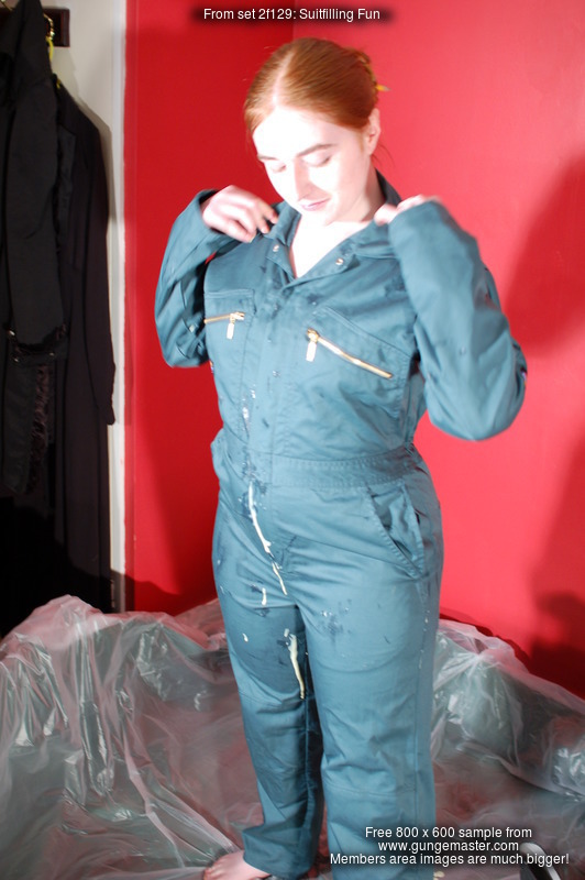 The theme was suitfilling, in this case, starting with a swimsuit, and then, once it's well filled, pulling on a clean boilersuit over it, and completely covering that too, while it's also being filled by all the custard leaking from the swimsuit.