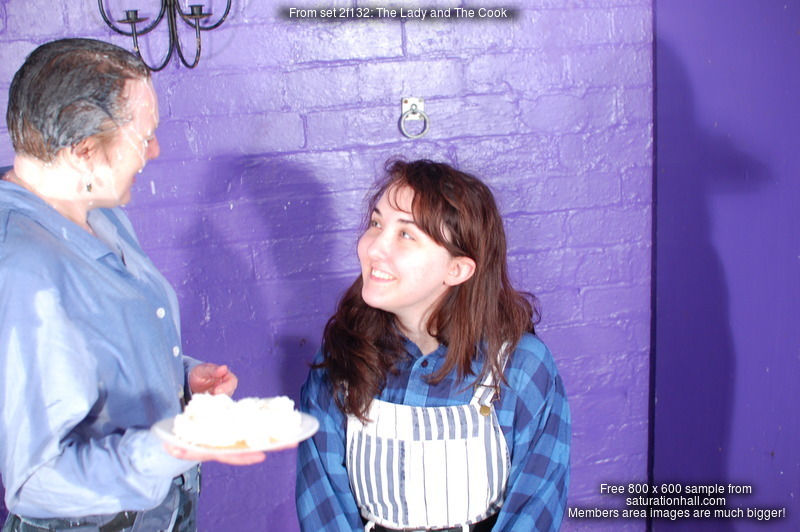 Milk down Evelyne's combats comes first, then custard gets poured in too. Then it's custard down the dungarees time for Lady Rose, who happily accepts her messy fate as Cook gets to work on her.