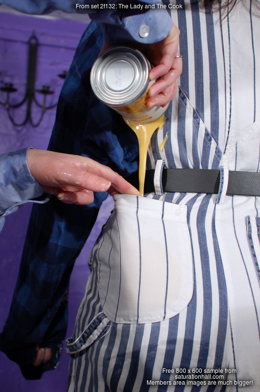 Scarlet suffers first, lashings of custard poured inside her skirt and then, once the damp stains coming through her skirt from the inside are well developed, more of it poured all over her blouse. But then it's Morgana's turn, and first she has golden syrup poured into her overalls, and then milk poured into her swimsuit from where it floods out through her overalls.