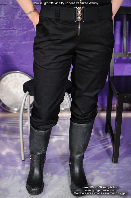 They have milk, custard, and squirty cream, and before long their outfits and their footwear are suffering. Kittys suit and Nurse Wendy's uniform dress are soon well filled with mess, likewise Kitty's wellies and the nurse's deck shoes get filled too, and by the end of the scene both girls are covered in mess from head to toe and soaking wet through.